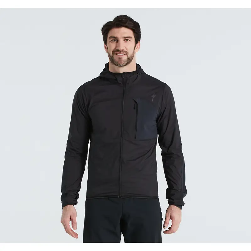 Specialized Trail SWAT Jacket in Black: Breathable, wind-resistant cycling jacket with DWR coating and minimal bulk for easy storage. Ideal for unexpected weather on the trail.